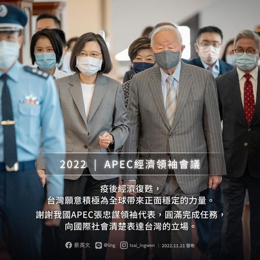 蔡總統晚間透過臉書發文指出,今年度的APEC經濟領袖會議11月19日在泰國曼谷落幕。面對疫後經濟復甦的重要時刻,以及各項挑戰,APEC成員國有共同的責任,為疫後亞太區域開展經濟新局。